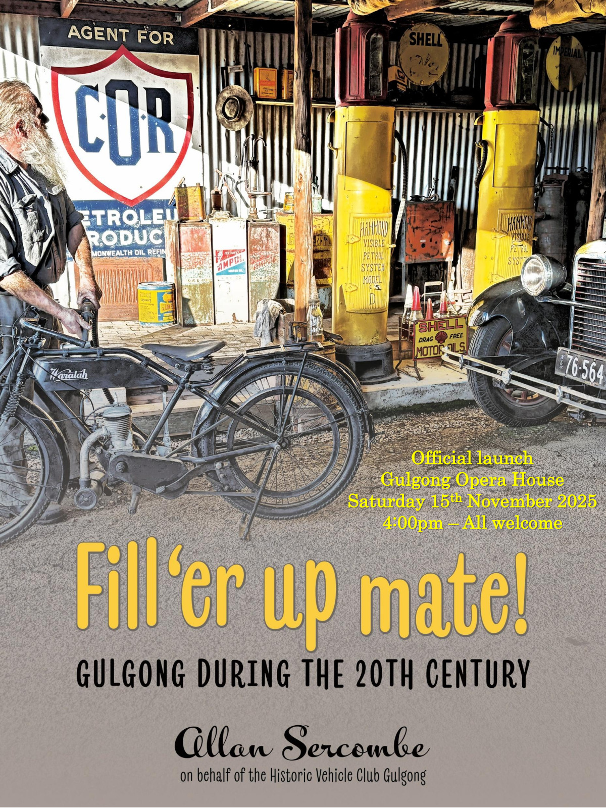 The book launch of Fill’er up mate! will occur on 15th November 2025, 4:00pm at the Gulgong Opera House.
